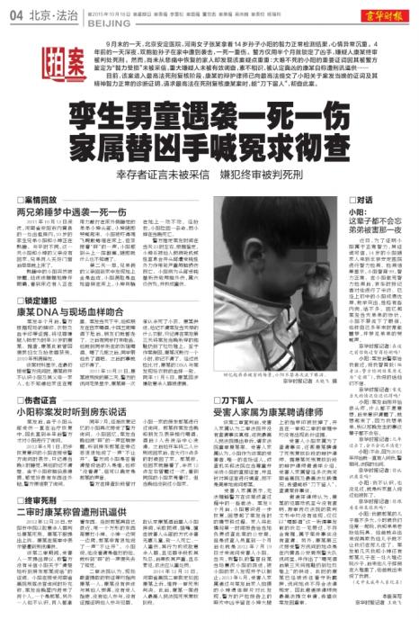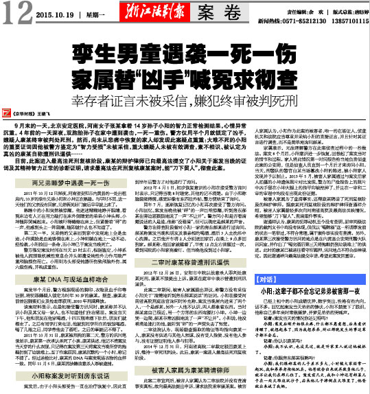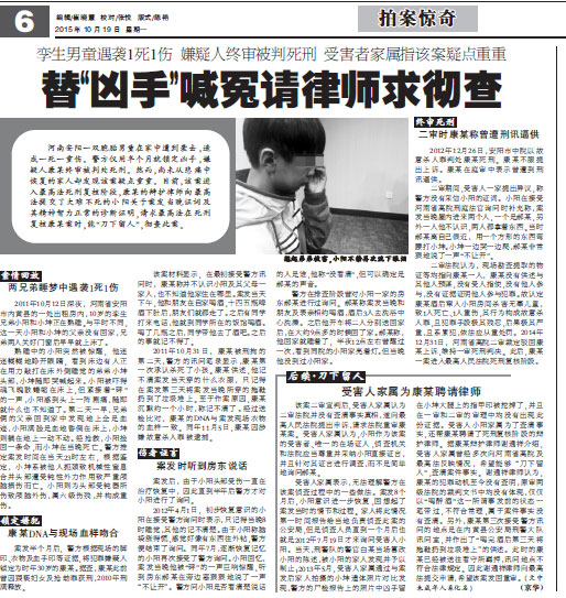 北京死刑复核律师:最高法院死刑复核阶段被害家属替被告人喊冤 9月末的一天,北京安定医院,河南女子张某拿着14岁孙子小阳的智力正常检测结果,心情异常沉重。4年前的一天深夜,双胞胎孙子在家中遭到袭击,一死一重伤。警方仅用半个月就锁定了凶手,嫌疑人康某终审被判处死刑。然而,尚未从悲痛中恢复的家人却发现该案疑点重重:大难不死的小阳的重要证词因其被警方鉴定为“智力受损”未被采信,重大嫌疑人未被有效调查,素不相识、被认定真凶的康某自称遭刑讯逼供…… 目前,该案进入最高法死刑复核阶段,康某的辩护律师已向最高法提交了小阳关于案发当晚的证词及其精神智力正常的诊断证明,请求最高法在死刑复核康某案时,能“刀下留人”,彻查此案。 案情回放 两兄弟睡梦中遇袭一死一伤 2011年10月12日深夜,河南省安阳市内黄县的一处出租房内,10岁的孪生兄弟小阳和小坤正在熟睡。与平时不同,这一天小阳和小坤的父亲没有回家,兄弟两人关好门窗后早早就上床了。 熟睡中的小阳突然被惊醒,他迷迷糊糊地睁开眼睛,看到床边有人正在用力敲打在床外侧睡觉的弟弟小坤头部,小坤随即哭喊起来。小阳被吓得魂飞魄散蜷缩在床上,但紧接着“砰”的一声,小阳感到头上一阵剧痛,随即就什么也不知道了。 第二天一早,兄弟俩的父亲回到家中发现地上全是血迹,小阳满脸是血地昏倒在床上,小坤则躺在地上一动不动。经抢救,小阳捡回一条命,而小坤在当晚死亡。 警方推定案发时间在当天23时左右,根据鉴定,小坤系被他人扼颈致机械性窒息合并头部遭受钝性外力作用致严重颅脑损伤而亡。小阳则为头部受钝器所伤致颅脑外伤,属六级伤残,并构成重伤。 锁定嫌犯 康某DNA与现场血样吻合 案发半个月后,警方根据现场的脚印、衣物及血手印等证据,将犯罪嫌疑人锁定为时年30岁的康某。据查,康某此前曾因猥亵妇女及抢劫罪获刑,2010年刑满释放。 该案材料显示,在最初接受警方讯问时,康某称并不认识小阳及其父母一家人,也不知道他家住在哪里。案发当天下午,他和朋友在自家喝酒,十四五瓶啤酒下肚后,朋友们就都走了。之后有同学打来电话,他就到同学所在的饭馆喝酒。喝了几瓶之后,同学带他去了酒吧。之后的事就记不得了。 2011年10月31日,康某被刑拘的第二天,警方的讯问笔录显示,康某第一次承认杀死了小孩。康某供述,他记不清案发当天穿的什么衣服,只记得在案发第三天将案发当晚所穿的拖鞋扔到了垃圾堆上。至于作案原因,康某沉默约一个小时,称记不清了。经过送检比对,康某的DNA与案发现场衣物的血样一致。同年11月5日,康某因涉嫌故意杀人罪被逮捕。 伤者证言 小阳称案发时听到房东说话 案发后,由于小阳头部受伤一直在治疗恢复中,因此直到半年后警方才对小阳进行了询问。 2012年4月1日,初步恢复意识的小阳在接受警方询问时表示,只记得当晚8时睡觉,其他的记不清楚。由于小阳称脑袋涨得慌,感觉好像有东西往外钻,警方便结束了询问。 同年7月,逐渐恢复记忆的小阳再次接受了警方询问。小阳回忆,案发当晚他被“砰”的一声巨响惊醒,听到房东郝某在旁边恶狠狠地说了一声“不让开”。警方问小阳是否看清楚说话的人是谁,他称“没看清”,但可以确定是郝某的声音。 警方在排查阶段曾对小阳一家的房东郝某进行过询问。郝某称案发当晚和朋友及表亲相约喝酒,酒后3人去洗浴中心洗澡。之后他开车将二人分别送回家后,在大约9点多的时候回了家。郝某称,他回家就睡着了,半夜12点左右曾醒过一次,看到同院的小阳家亮着灯。但当晚他没到过小阳家。 终审死刑 二审时康某称曾遭刑讯逼供 2012年12月26日,安阳市中院以故意杀人罪判处康某死刑。康某不服提出上诉。康某在庭审中表示曾遭到刑讯逼供。 该案二审期间,受害人一家提出异议,称警方没有采信小阳关于“清楚地听到房东郝某说话”的证词。小阳在接受河南省高院刑庭法官询问时补充称,案发当晚屋内进来了两个人,一个是郝某,另外一人他不认识,两人都拿着东西。当时郝某离自己很近,用一个方形的东西弯腰打小坤。小坤一边哭一边爬,郝某非常狠地说了一声“不让开”。小阳说,他没看清是谁打的他,就听到“砰”的一声便失去了知觉。 二审法院认为,现场勘查提取的物证等均指向康某一人,康某没有供述与其他人预谋,没有受人指使、没有他人参与,没有证据证明他人参与犯罪。 故认定康某酒后窜入小阳房间,采取扼颈、捂嘴、撞击被害人头部的方式杀害无辜儿童,致一人死亡、一人重伤,其行为构成故意杀人罪,且犯罪手段极其残忍,后果极其严重,且系累犯,依法应从重处罚。 2014年12月31日,河南省高院二审裁定驳回康某上诉,维持一审死刑判决。此后,康某一案进入最高人民法院死刑复核阶段。 刀下留人 受害人家属为康某聘请律师 该案二审宣判后,受害人家属认为二审法院并没有查清事实真相,遂向最高人民法院提出申诉,请求法院重审康某案。受害人家属认为,小阳作为该案的受害者、唯一的在场证人,侦查机关和法院应当尊重并采纳小阳的直接证言,并且针对其证言进行调查,而不是简单地询问郝某。 受害人家属表示,无法理解警方在该案侦查过程中的一些做法。案发8个月后,小阳意识进一步恢复,回想起了案发当时的情节和过程。家人将此情况第一时间报告给当